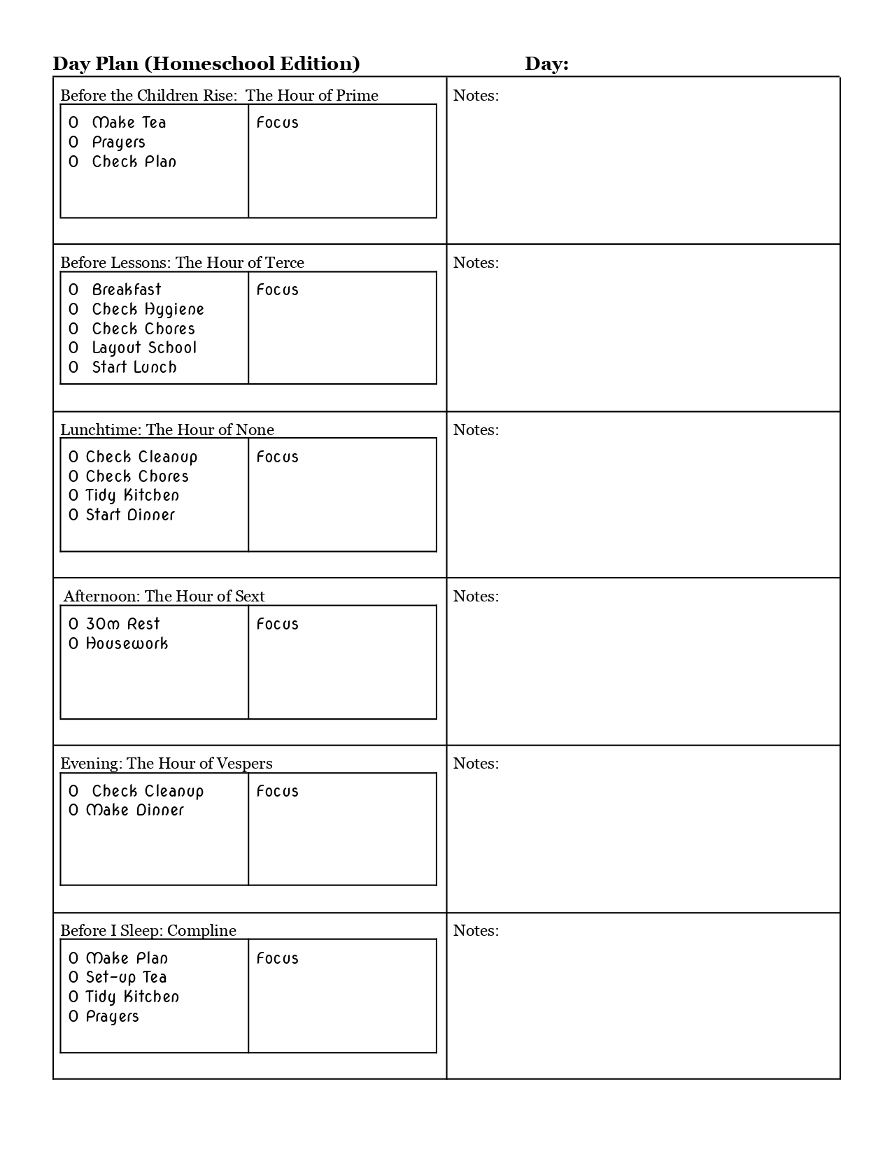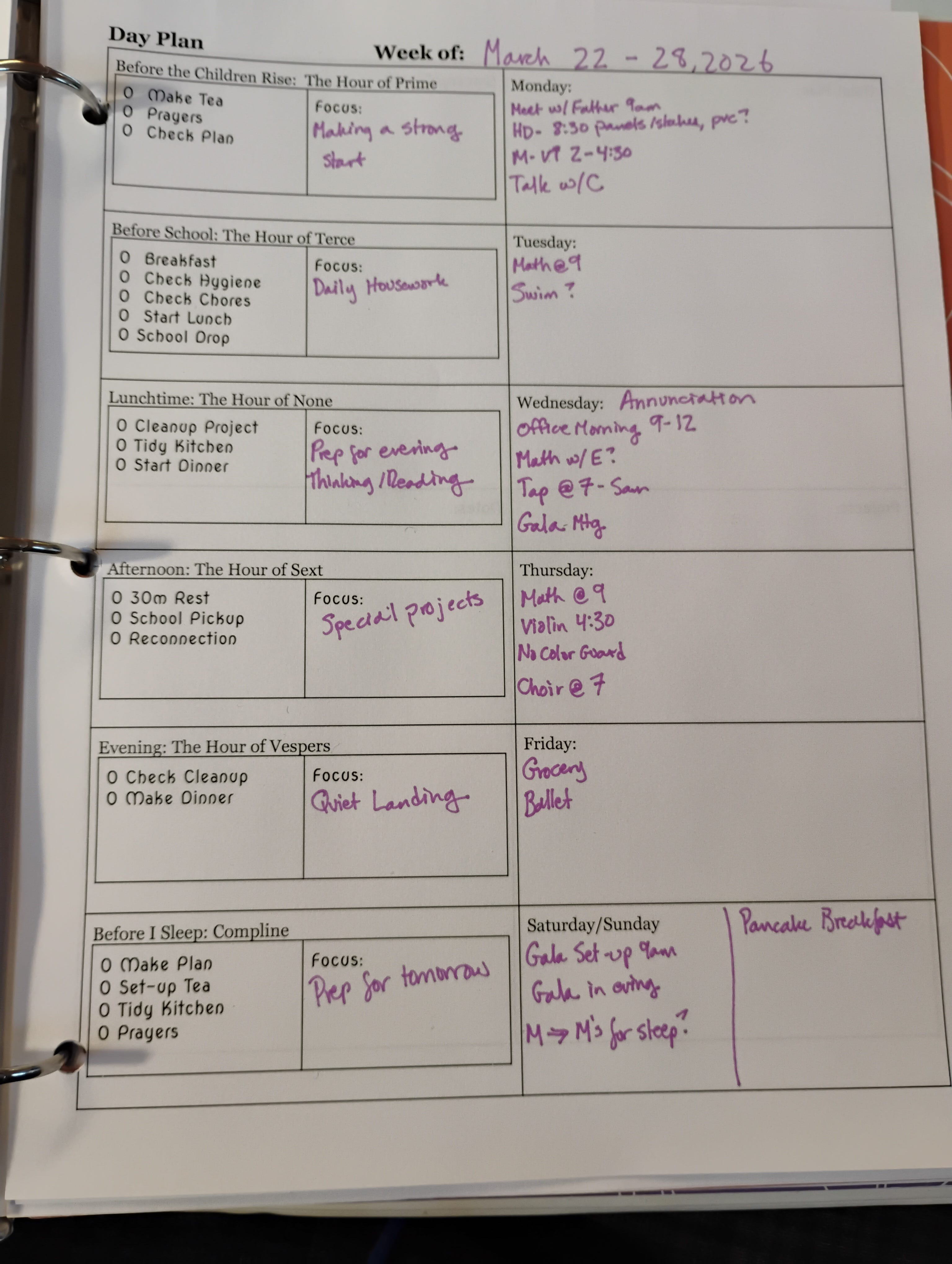 I have four sections in my binder: the Liturgy of the Hours for Mothers with the Lectionary readings and collects through Holy Week, plans for weeks that are past that I can refer to as needed, cleaning lists for each room, and a section for projects that has lists of ideas, the plan for the garden and so on. During the day the binder sits open near my tea tray where it is easy to see and use. I generally review the day plan first thing in the morning and then keep the binder open to prayer cycle.