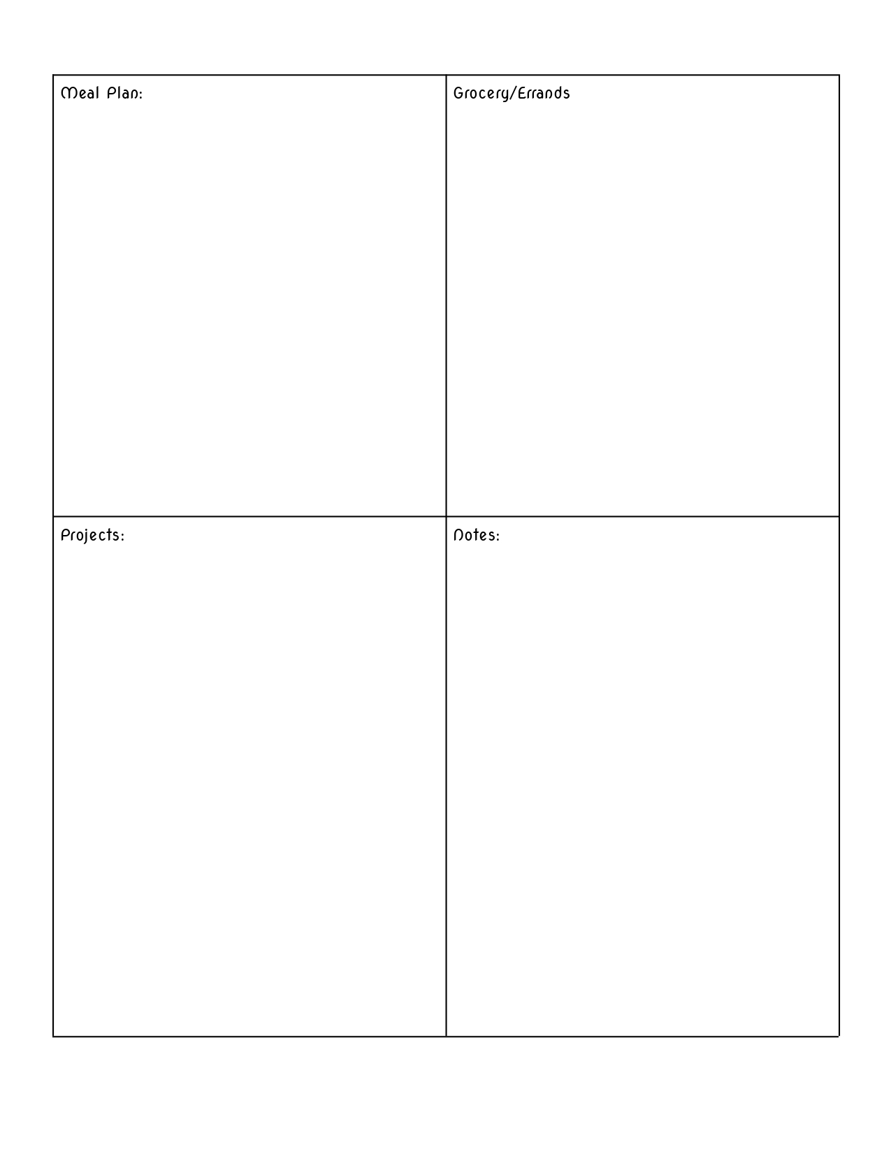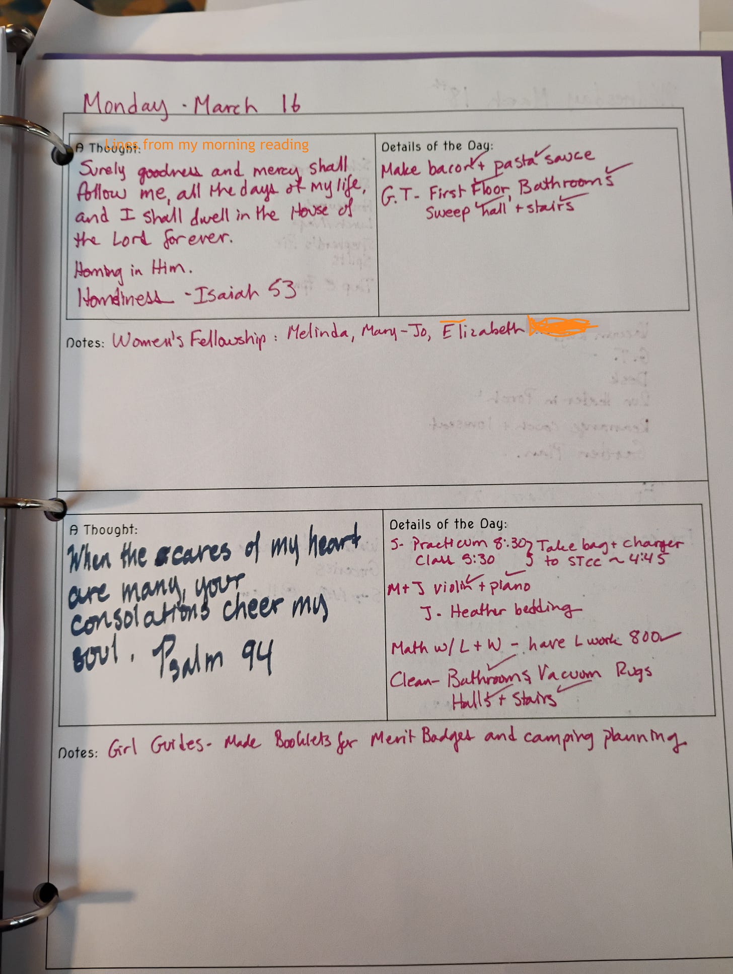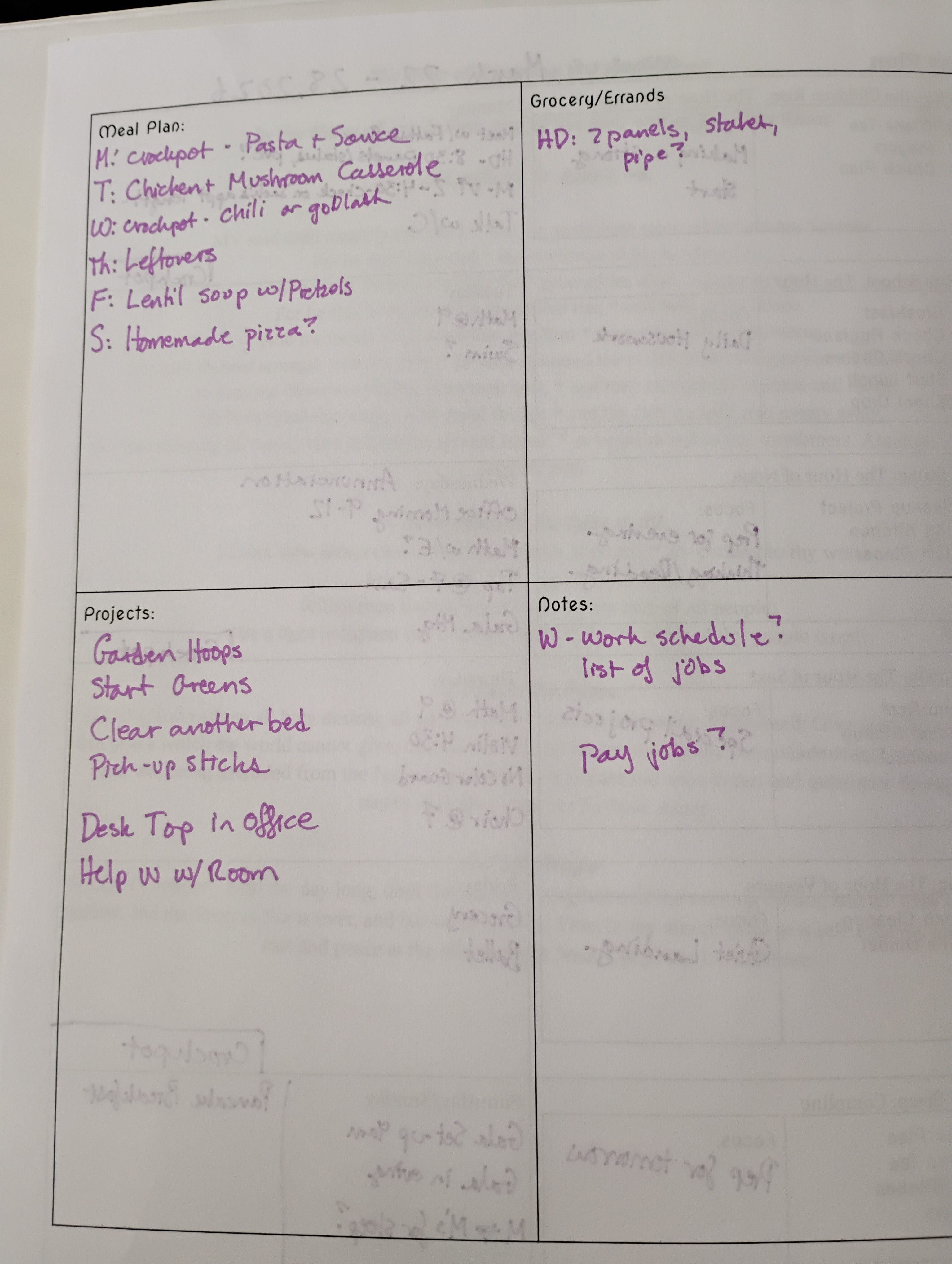 This is the guide I follow for the day, checking off what actually gets done, and moving undone things onto the next day’s page.